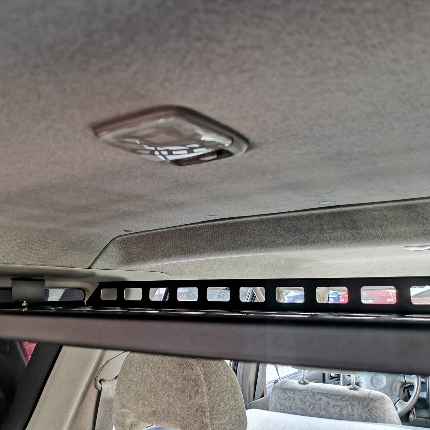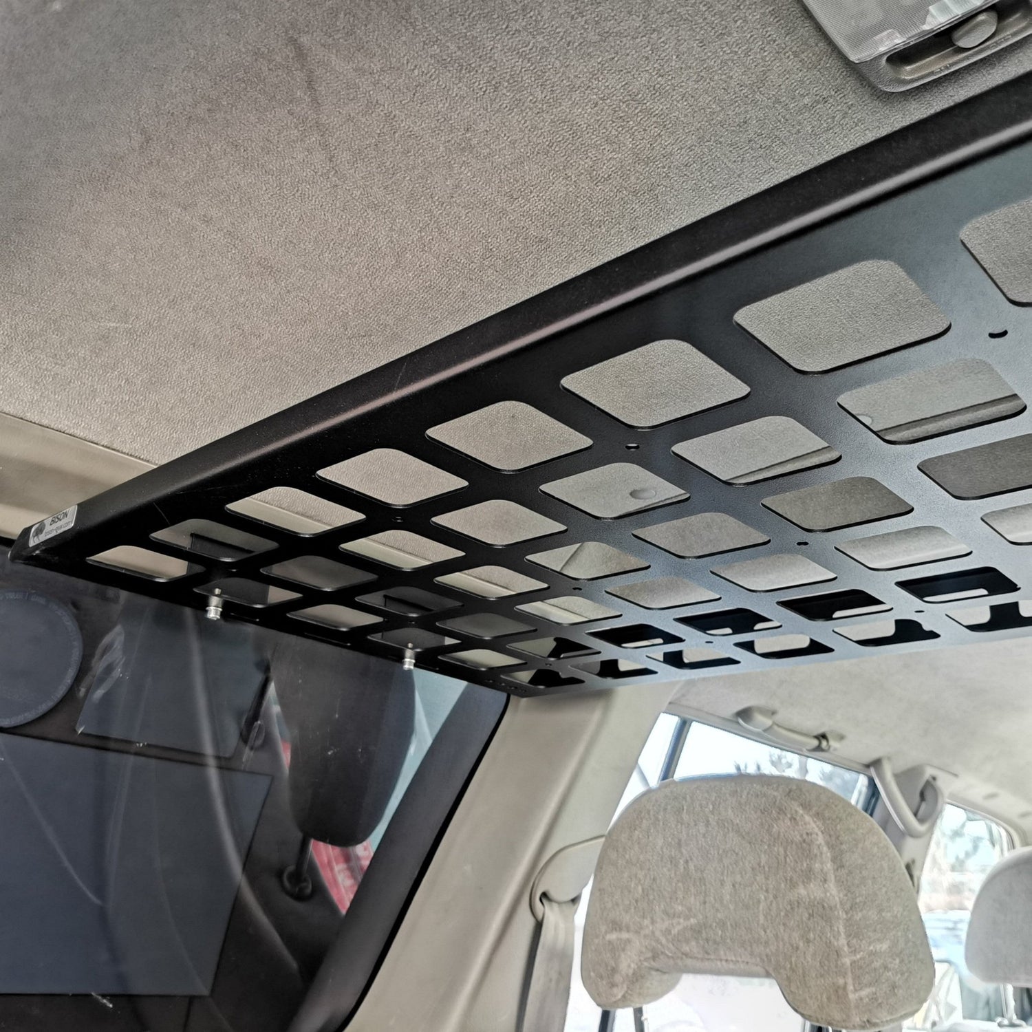 Designed for straightforward installation, this shelf fits models equipped with 3rd-row seat mounting points. It integrates perfectly into the ceiling of your Patrol without the need for drilling or modifications. At just 6.3 kg, the steel structure is lightweight yet strong, and its compact design maintains a maximum 15 cm clearance from the roof, so it won’t obstruct your rearview mirror while driving.
