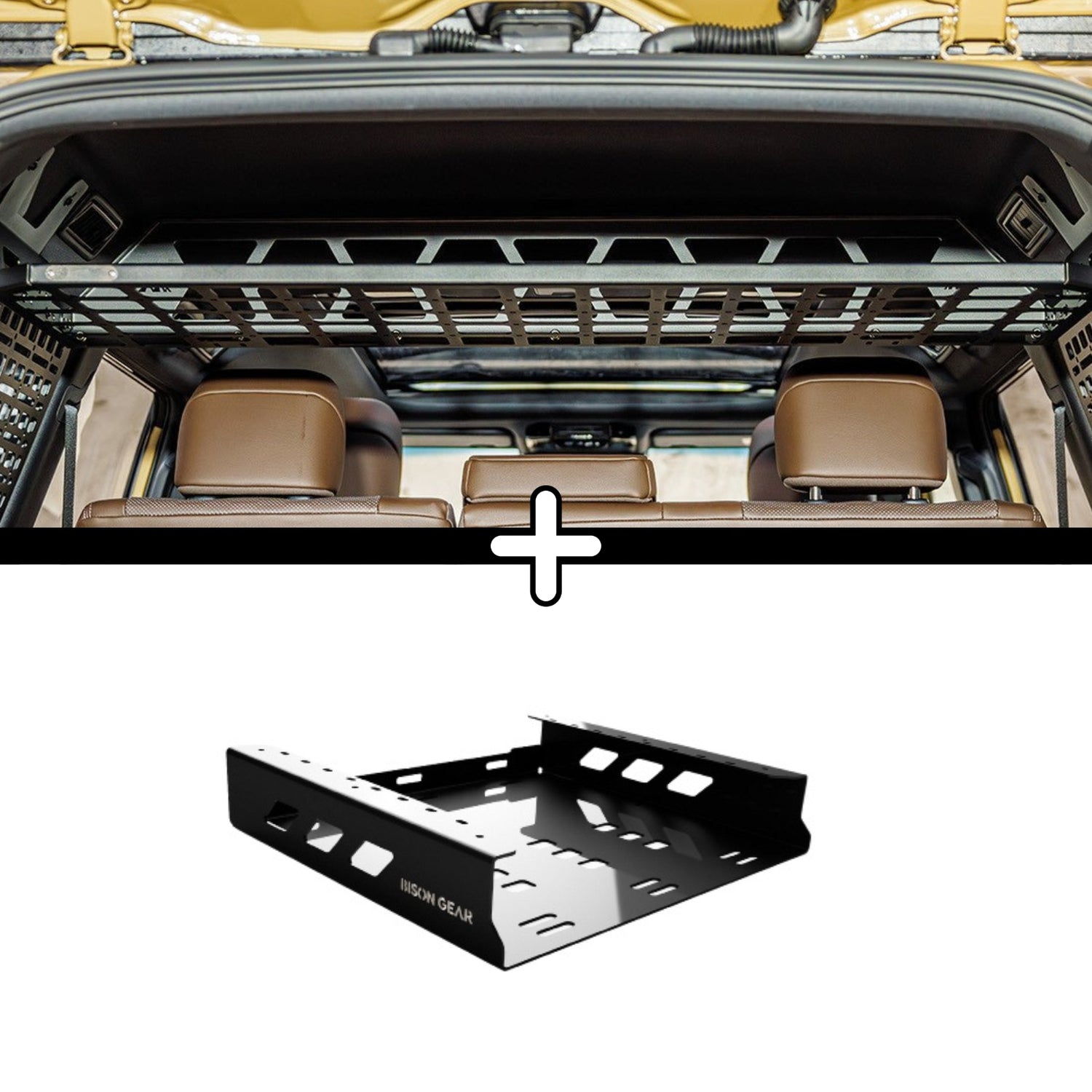 - Półka Wyprawowa Bison Gear – wewnętrzna półka dachowa wykonana z wysokowytrzymałej stali, wyposażona w zintegrowaną przegrodę dla bezpiecznego i uporządkowanego przechowywania narzędzi, sprzętu i akcesoriów. Pokryta czarną farbą proszkową zapewnia odporność na korozję oraz estetyczną integrację z wnętrzem pojazdu.